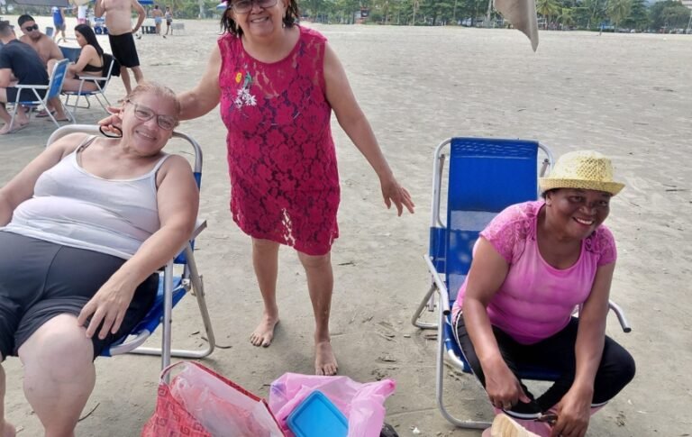 A Praia José Menino, em Santos, foi a escolhida para que o grupo pudesse ter momentos felizes “É maravilhoso! Entrei, brinquei, levei pra água comigo